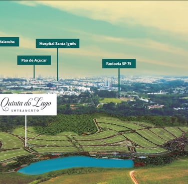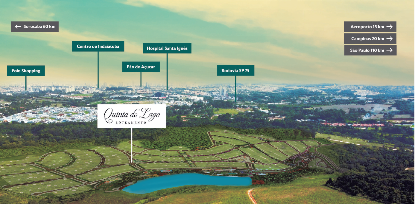 Em localização estratégica, o loteamento Quinta do Lago une a conveniência de morar em um local privilegiado pela natureza e próximo a todas as comodidades e serviços necessários para o dia a dia, pensado para você viver com qualidade de vida e praticidade. Localizado a apenas 10 minutos do centro comercial de Indaiatuba, o loteamento tem fácil acesso às rodovias dos Bandeirantes e Anhanguera, contando com o benefício de estar a 15 km do Aeroporto Internacional de Viracopos e a 20 km de Campinas.